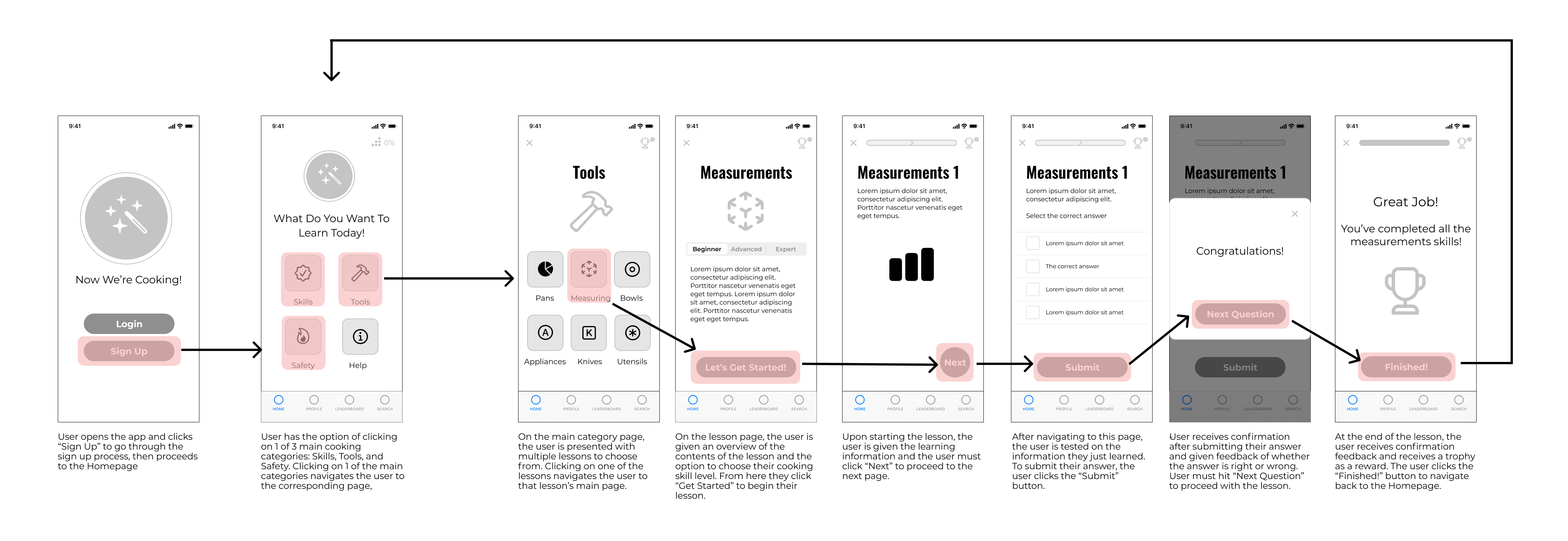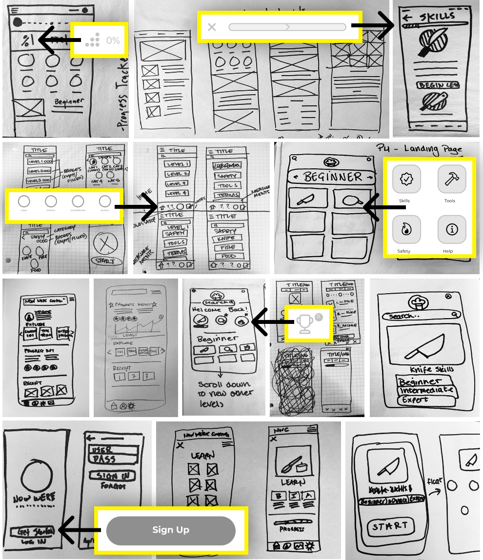 Our initial discovery phase was of great importance as since we were developing the app from the ground up, we needed a lot of preliminary information before we could move forward. So during this time we developed a screener survey and a concise interview guide so that we could interview those who fit into our demographic (beginner cooks) and receive tangible, beneficial results.